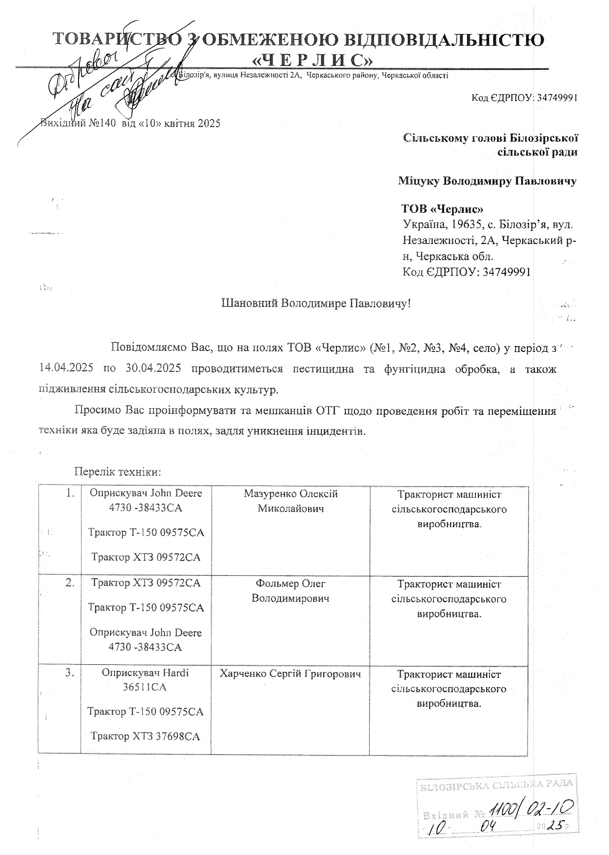 Про проведення робіт по пестицидній та фунгіцидній обробці
