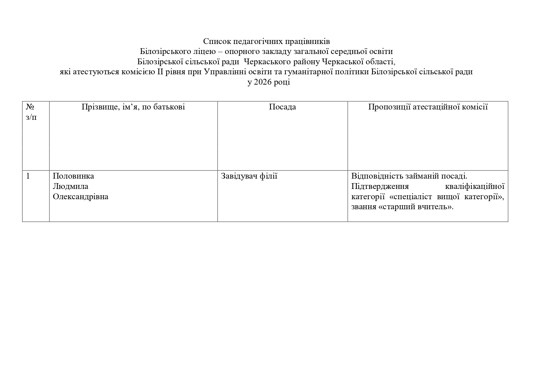 Список педагогічних працівників закладів та установ освіти Білозірської сільської ради, що підлягають черговій атестації у 2026 році