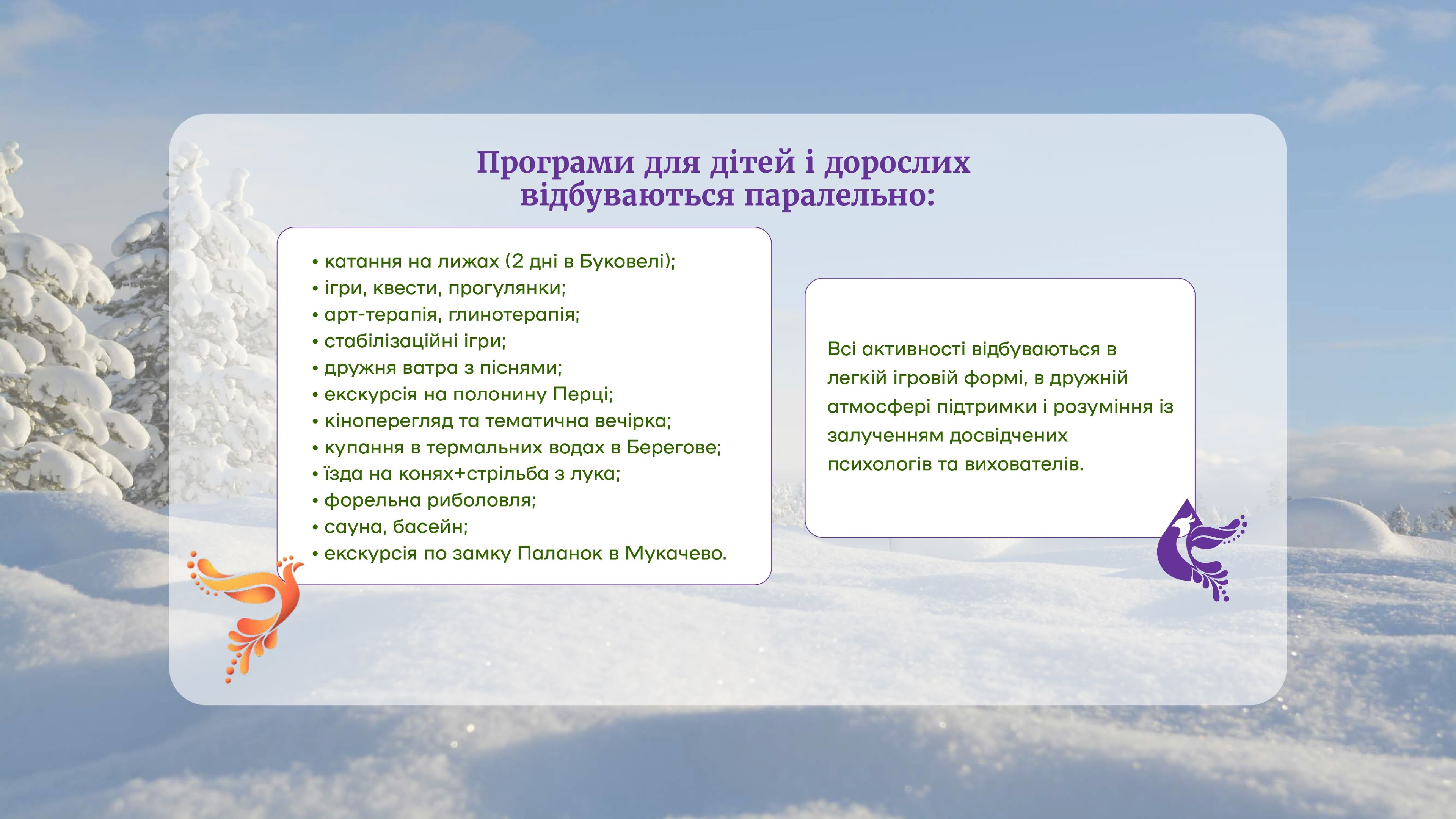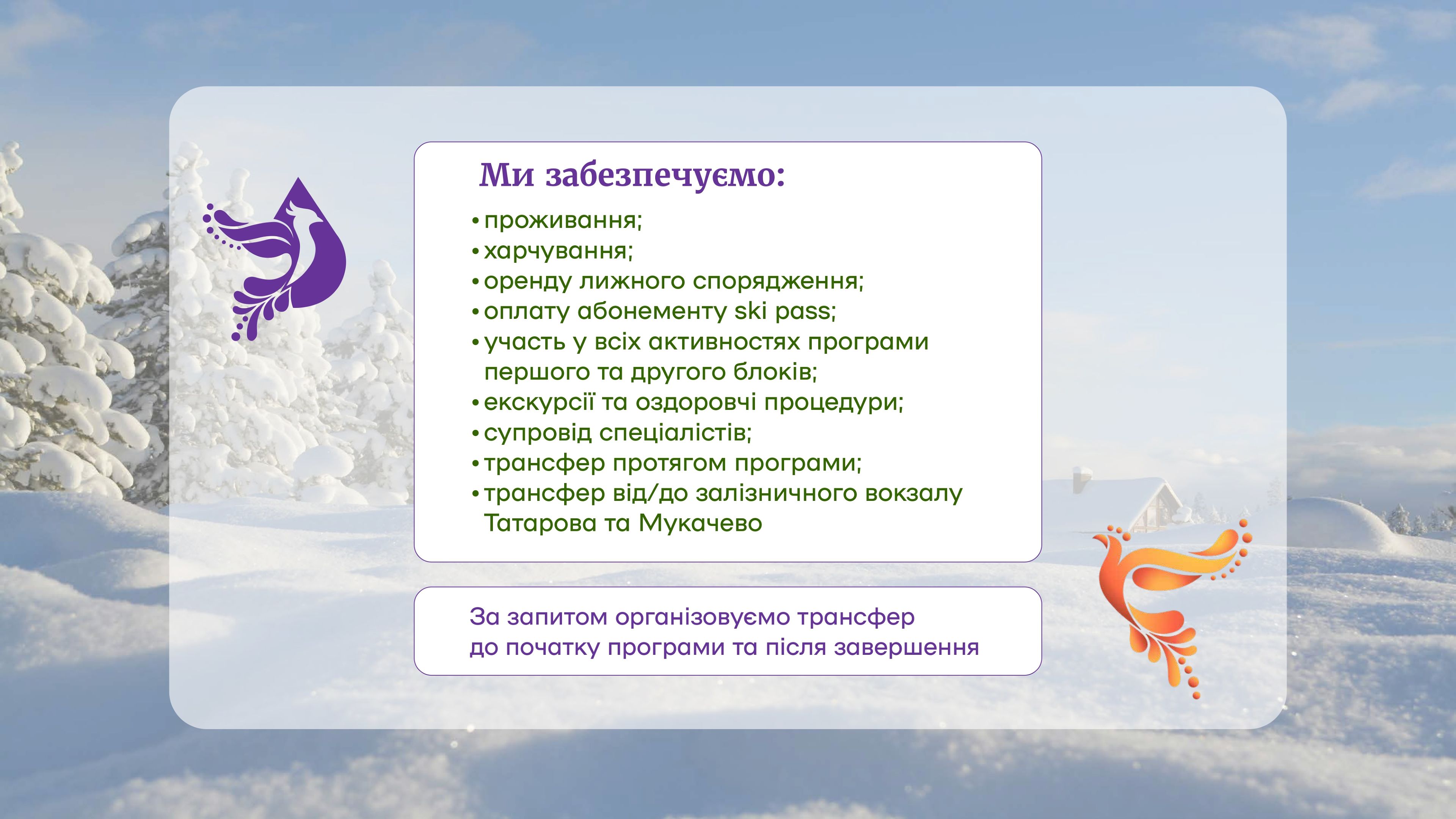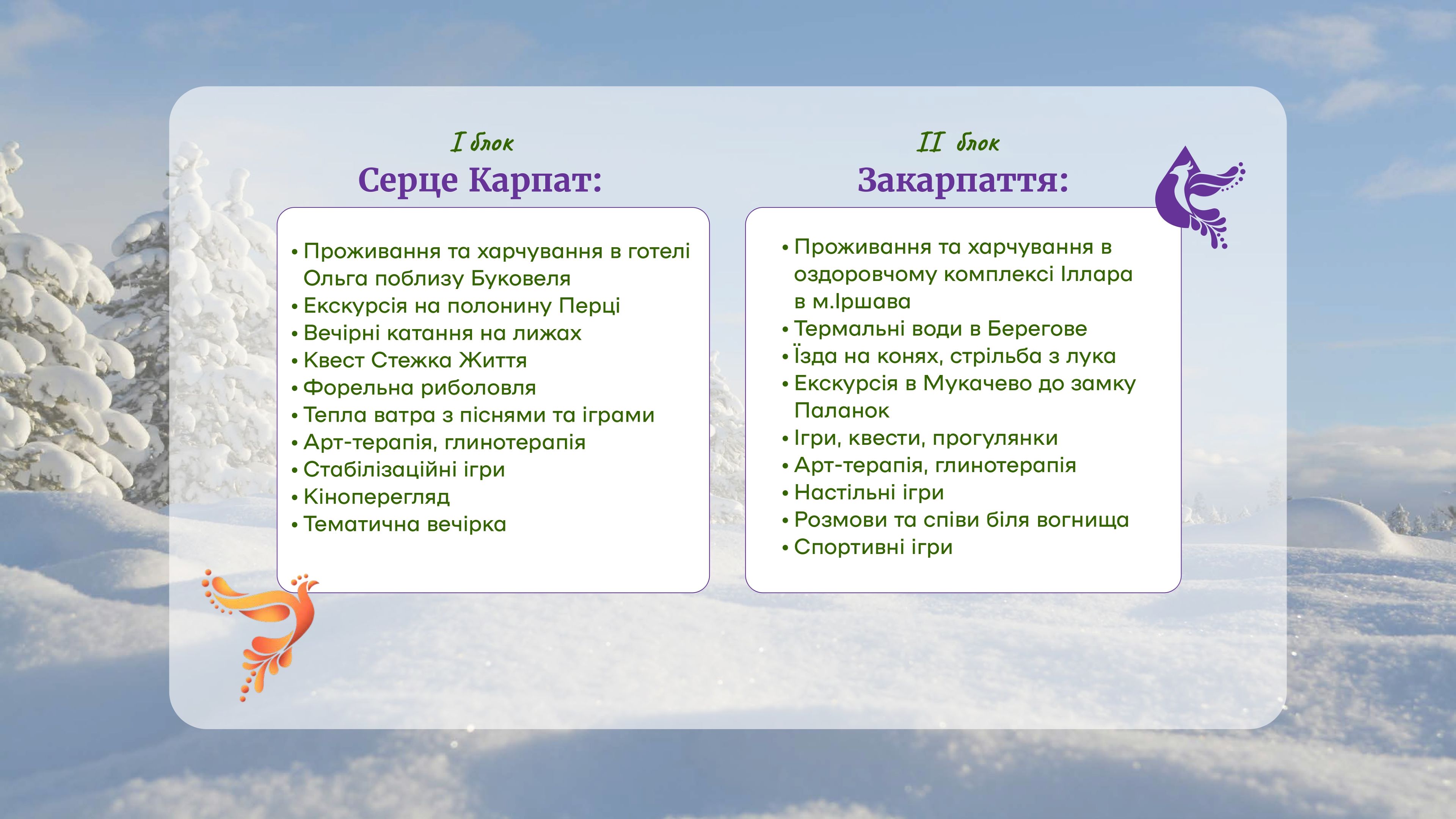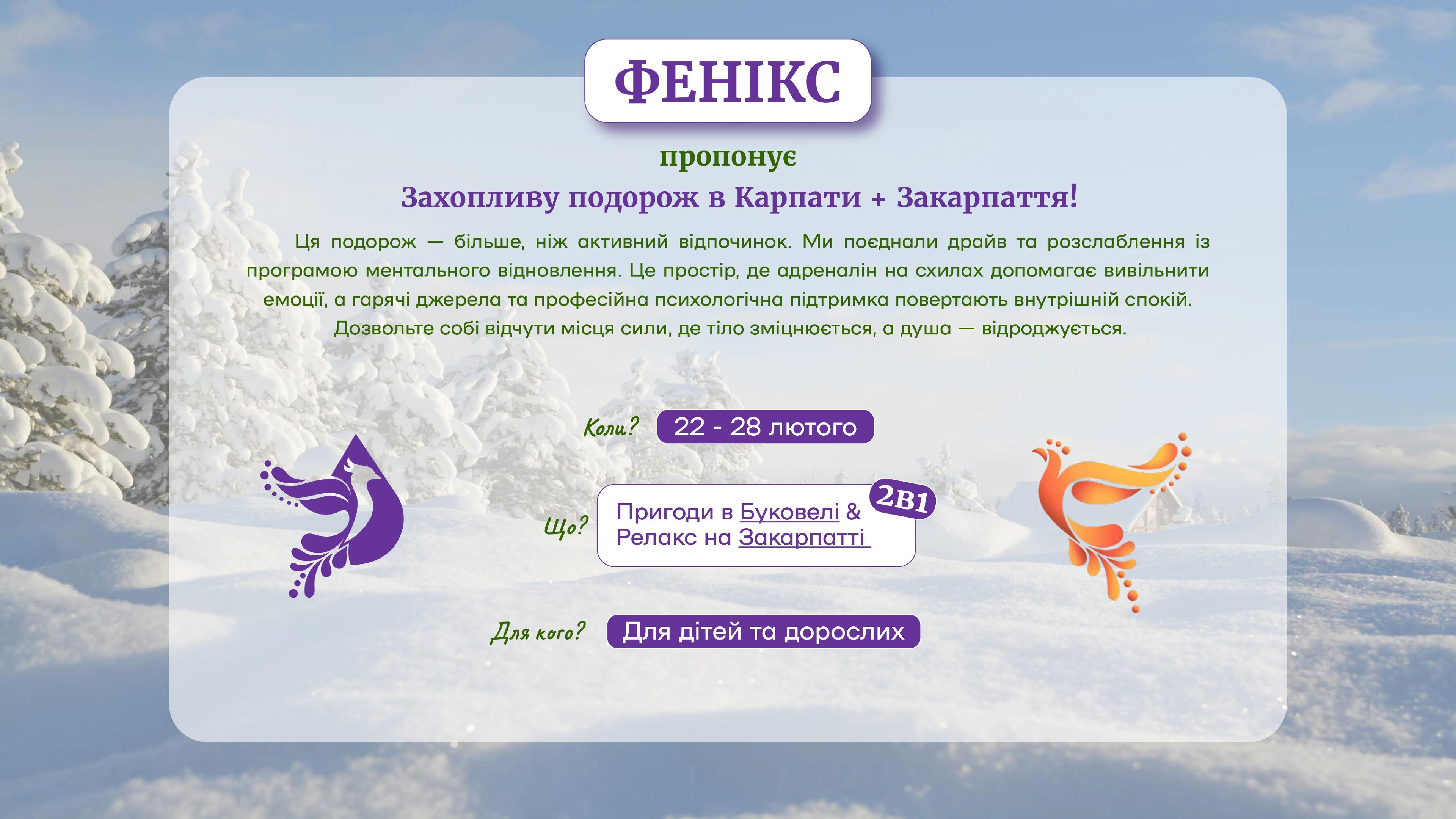 Служба військового капеланства Черкаської ТрО організовує відновний відпочинок за програмою «Фенікс-діти» дітей військовослужбовців усіх категорій: діючих військовослужбовців, тих, що перебувають у полоні, зниклих безвісти і тих, що загинули. Дітям буде забезпечено якісний відпочинок, який допоможе їм відновити ментальне здоров’я, поліпшити психологічний стан та наповнити життя радістю. Що стане важливим кроком до нормалізації їхнього життя. Табір відбудеться у 2 етапи: 22-24 лютого у Буковелі і 25-28 лютого – у Іршаві. Ці регіони Івано-Франківщини та Закарпаття обрані через високий рівень безпеки, розвинуту розважальну та спортивну інфраструктуру, європейський рівень побуту, незвичні і захоплюючі для дітей з Черкащини краєвиди Карпат. Забезпечуватимуться трансфер в обидві сторони, проживання, харчування, насичена змістовна програма (робота з психологами, пізнавальні та розважальні заходи), оренда обладнання та скіпаси (перепустки на гірськолижні витяги) на 2 дні., психофізична реабілітація (спортивні заняття, термальні води) та екскурсійна програма (відвідання історичних пам’яток в Мукачево, Полонини Перців, Будинку науки тощо). Загальна сума витрат з розрахунку на 1 дитину становить 18 200.00 грн. З концепцією програми «Фенікс» можна ознайомитися тут: Дитяча програма https://phoenixkids.supercamp.com.ua Доросла програма https://phoenixprogram.org.ua Реєстрацію на табір дітей Білозірської громади просимо їх батьками здійснити за посиланням: https://forms.gle/nXtmVkuioaZmSbT39 Телефони для консультацій: +380777880804